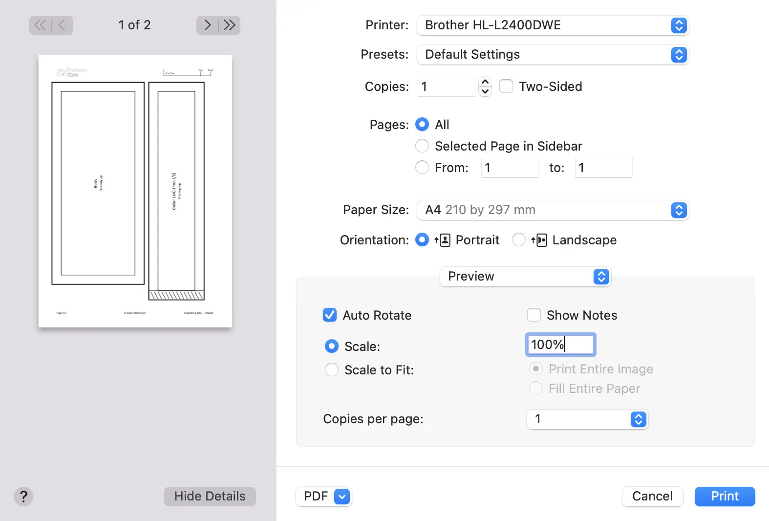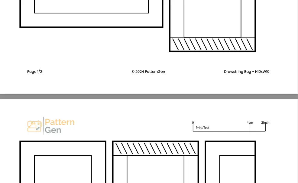Each page within the pattern file contains a print test in the header. Measure this to confirm the page has printed to the correct scale. If pattern pieces are too large for the chosen page size, they will be split into multiple pieces and will require sticking together after printing. These pieces will have hatched overlap tabs; simply lay one over the other and tape together.